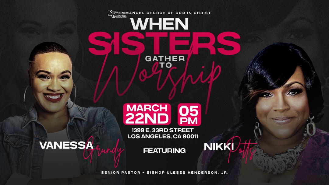 Get ready for a powerful evening of praise & purpose! Join us on Sunday, March 22nd at 5:00pm for When Sisters Gather to Worship featuring Vanessa Grundy and Nikki Potts. This will be an unforgettable atmosphere of worship and breakthrough you don't want to miss.