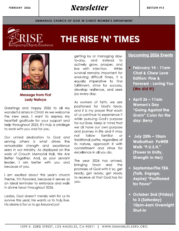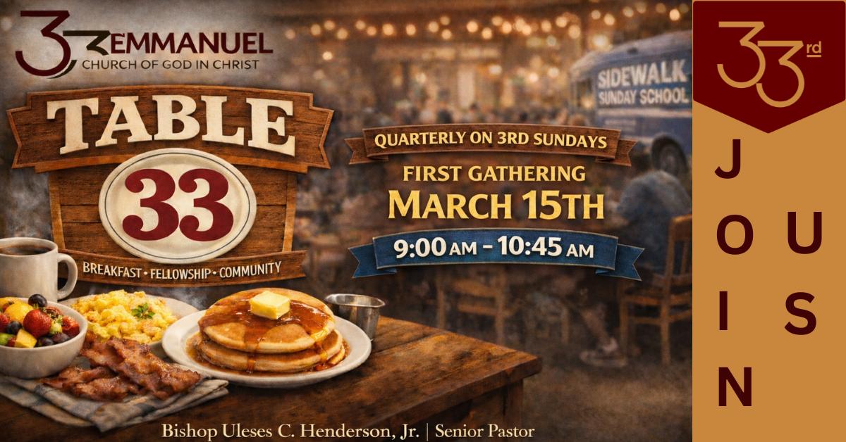 Starting March 15, 2026 and every third Sunday of each quarter, our pastor and first lady are thrilled to launch Table 33—a special breakfast experience right here at 33rd. All members and guests can enjoy a complimentary breakfast in the dining hall from 9:00 am to 10:45 am while supplies last.