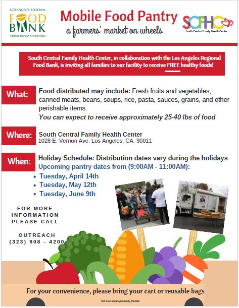South Central Family Health Center, in collaboration with the Los Angeles Regional Food Bank, is inviting all families to their facility to receive FREE healthy foods! Please see the banner for all dates and times or for more information please call Outreach at