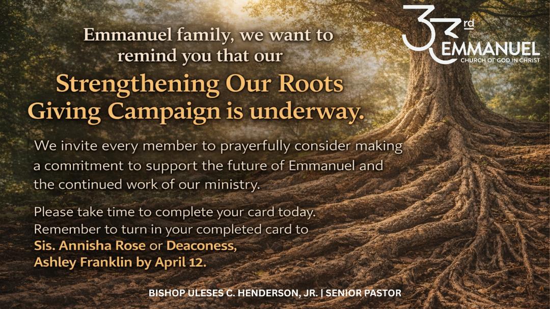 Please take time to complete your card today. Remember to turn in your completed card to Sis. Annisha Rose or Deaconess Ashley Franklin by April 12th. Thank you for strengthening the foundation of Emmanuel for the generations to come.