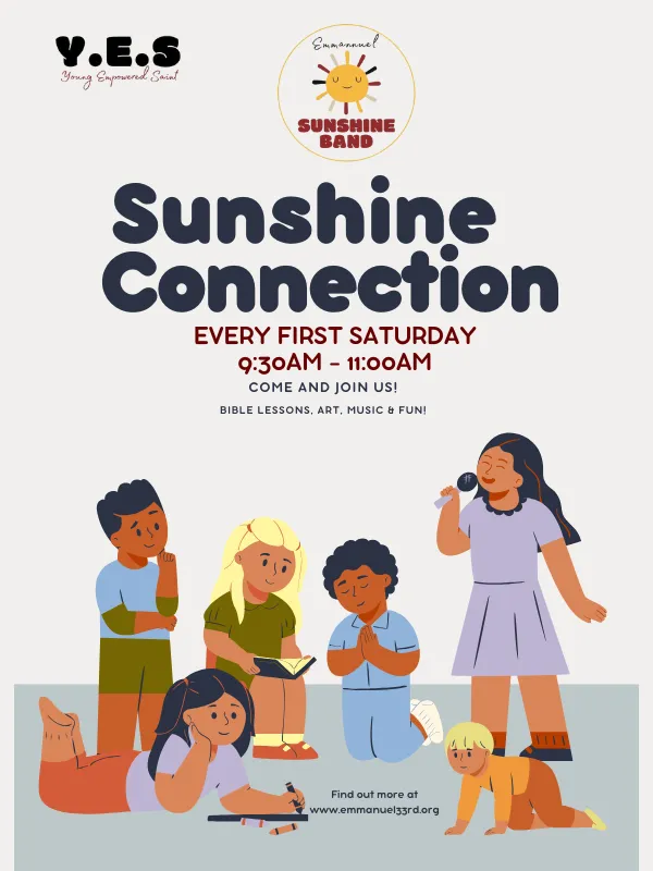 At Sunshine Connection, every child is welcomed, celebrated, and guided as they learn about Jesus through age - appropriate lessons, meaningful worship, and hands -on fun. This nurturing space helps young hearts grow in faith, build confidence, and shine with the love of Christ alongside new and old friends.